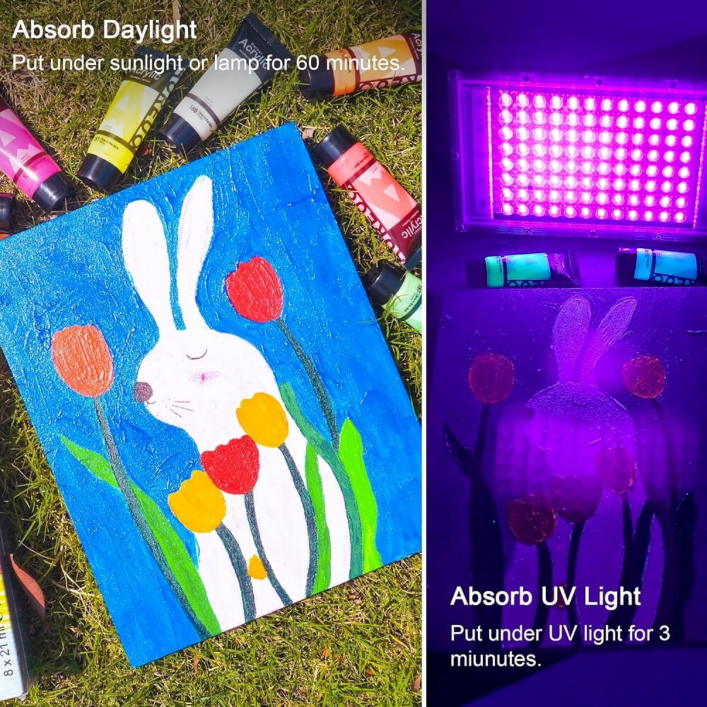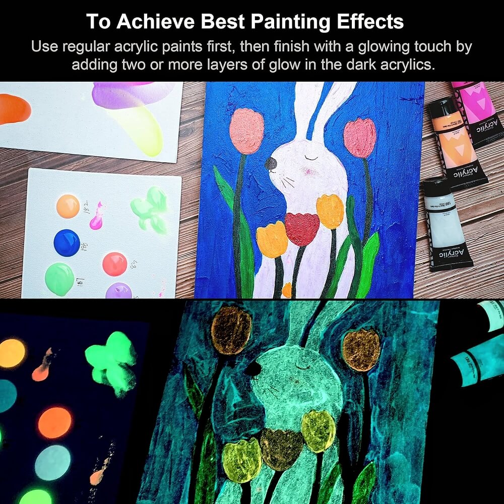 Use regular acrylics first, then paint with this AUREUO glow-in-the-dark acrylics by adding two or more layers for the best effects. Lastly, put paintings under sunlight for 60 minutes OR under UV light for 3 minutes. The paints can capture and store the light efficiently, glowing in the dark finally. Please shake evenly before use.