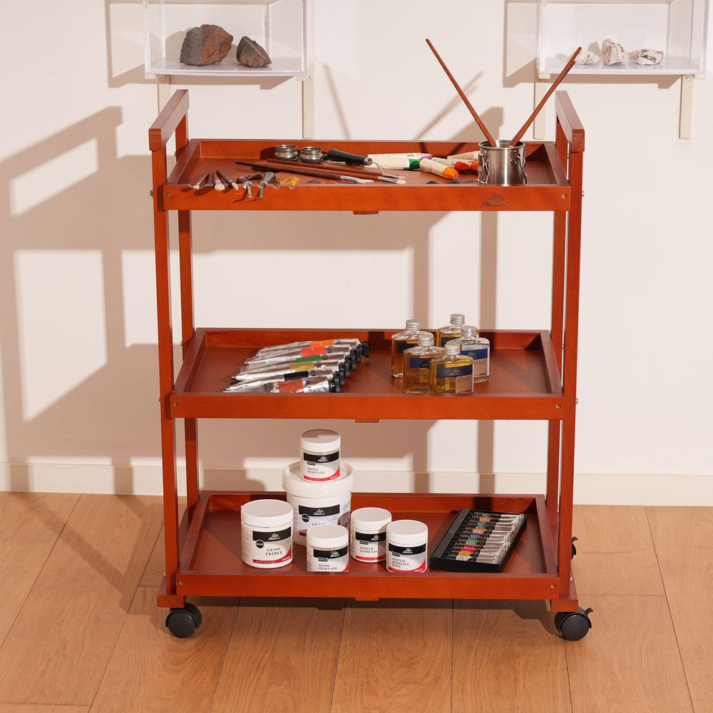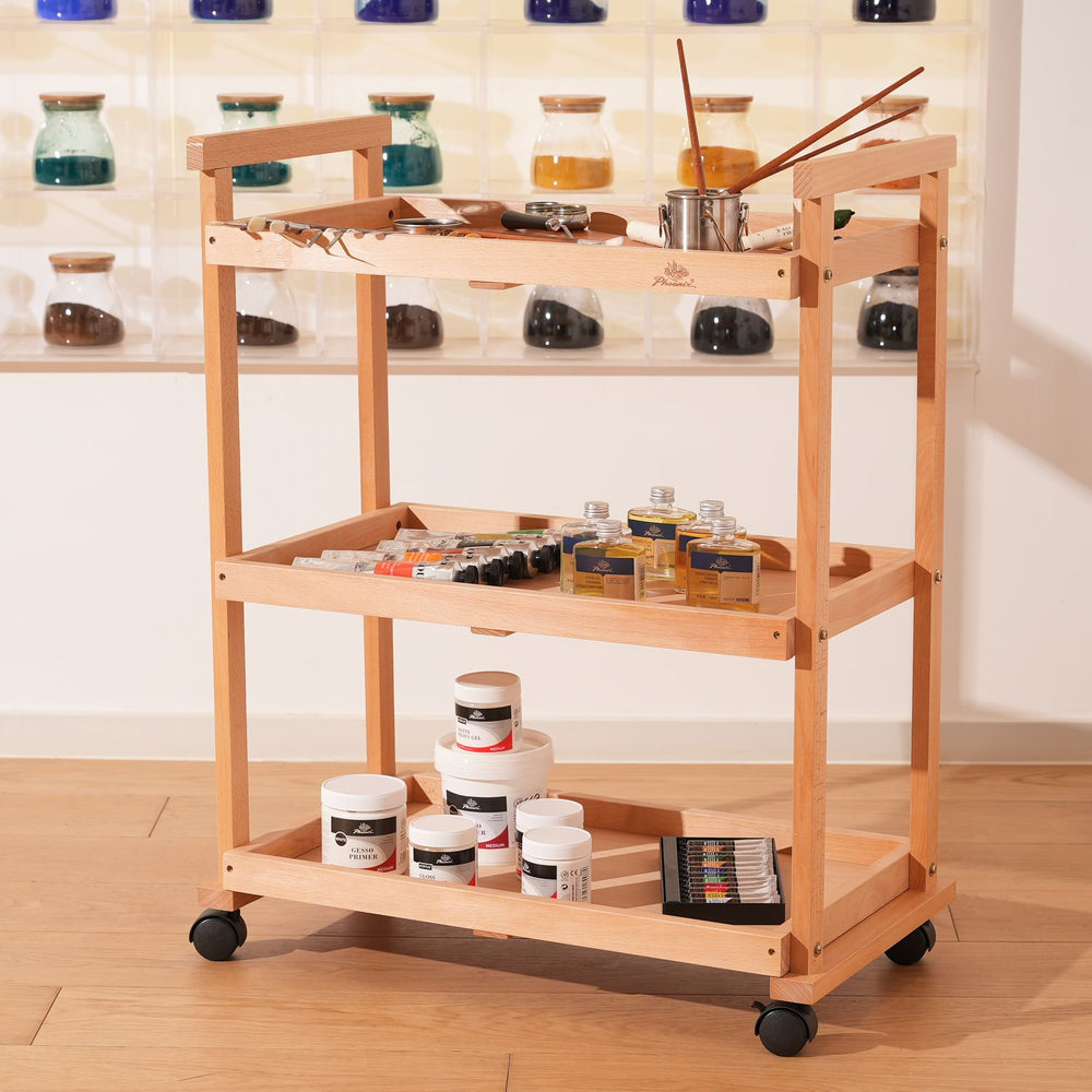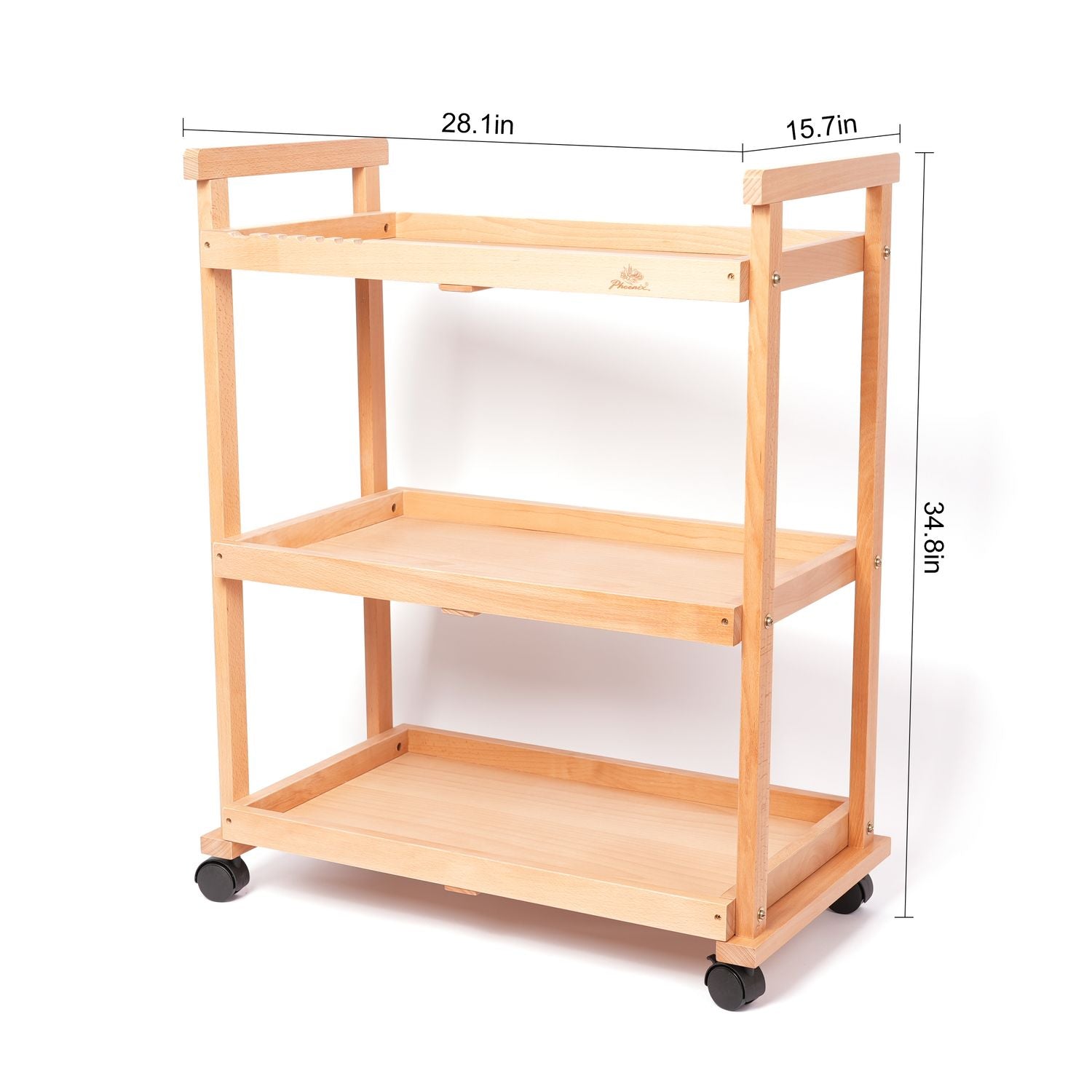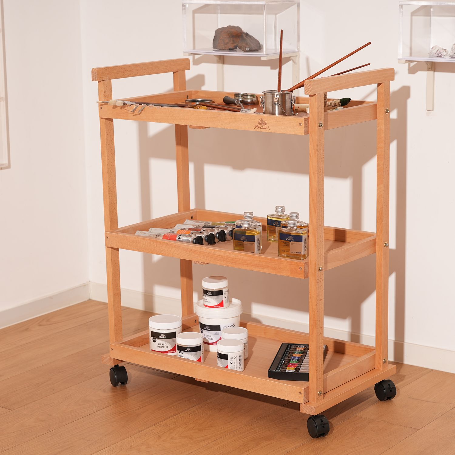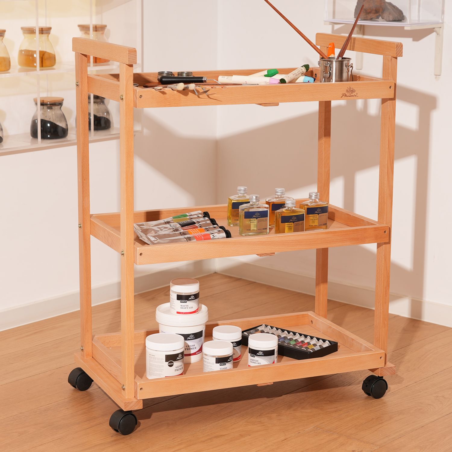 Crafted from durable solid beechwood, this 28.1" W × 15.7" D × 34.8" H art cart offers strength, stability, and a smooth oil-finished surface for safe daily studio use.