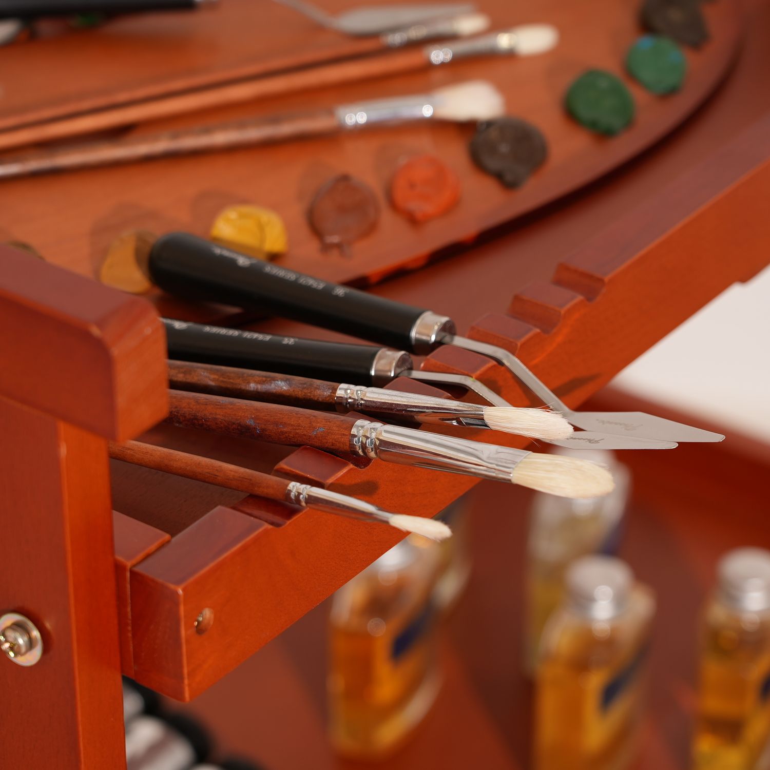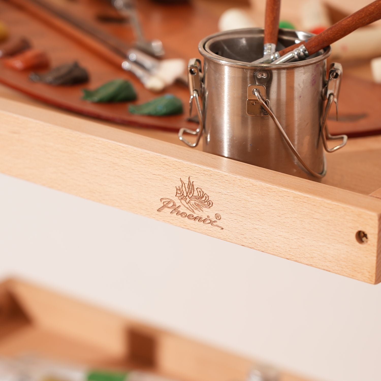 Minimalist design with a raised top edge and paint cup holder keeps supplies secure. Quick assembly makes it ideal for artists of all levels.