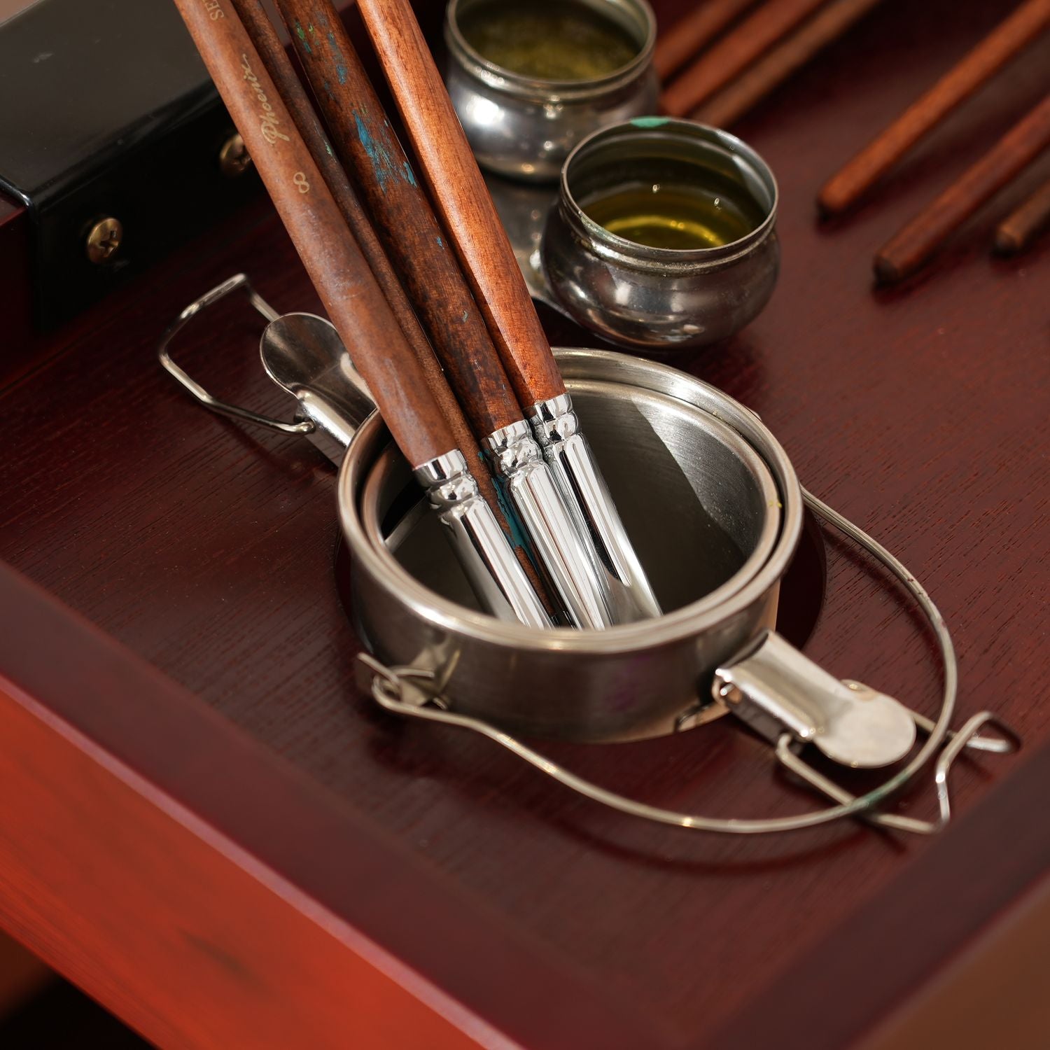 Built-in brush holder and round groove for brush washer keep tools organized and within reach, creating a clean, efficient, and optimized creative workspace.